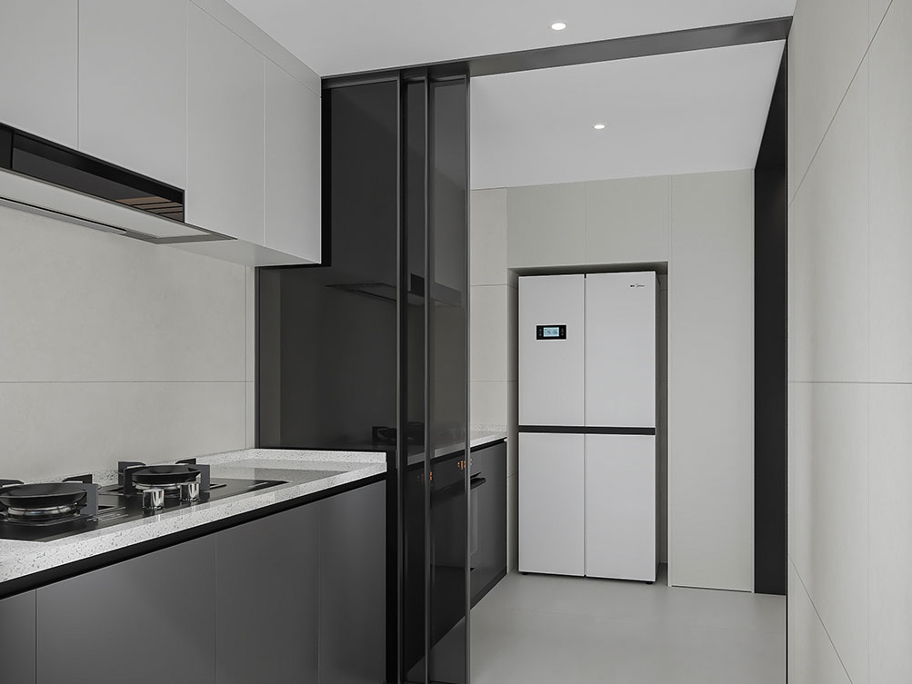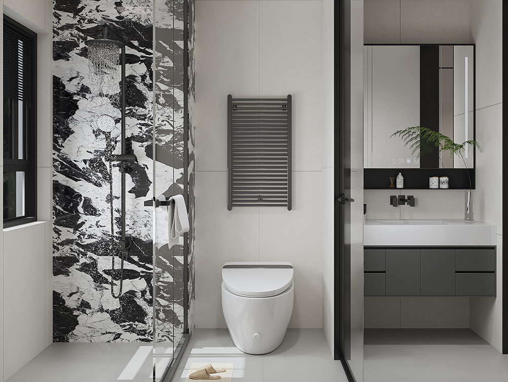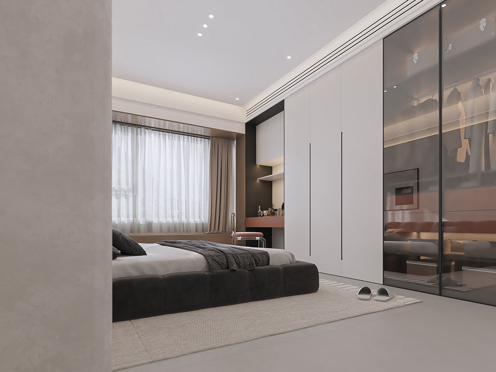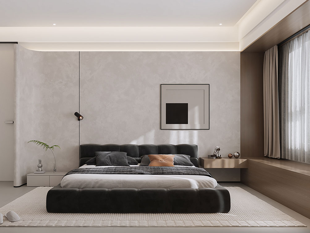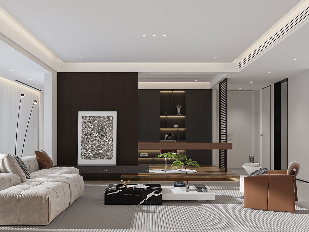 ??濟南阿達森裝飾為穎秀華府打造的現代極簡輕奢風。淺米色大尺寸沙發柔化空間,搭配焦糖棕單人椅,用撞色拉出層次感;黑白紋理茶幾與同質感背景墻呼應,高級又利落。深色木飾面 + 內嵌燈光的柜體,既做收納又成視覺焦點,懸浮式地臺延伸出松弛的休閑區,墻面藝術畫則添了藝術張力。整體以低飽和色調鋪底,通過材質對比平衡精致與舒適,剛好契合穎秀華府高端社區的品質調性,把都市大宅的松弛感穩穩拿捏。